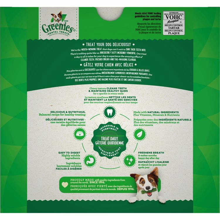 One GREENIES Original Dental Treat a day is all it takes for clean teeth, fresh breath, and a happy dog. Your dog can’t wait to sink their teeth into these delicious, original-flavor dental dog breath chews because they feature a delightfully chewy texture that fights plaque and tartar. Irresistibly tasty and incredibly powerful, GREENIES Treats for Dogs are vet-recommended for at-home oral health care and accepted by the VOHC (Veterinary Oral Health Council.) Best of all, these natural dog breath treats are made with highly soluble ingredients that are safe and easy to digest. Give your dog the mouth-wowing treat that helps promote their overall health with GREENIES Dog Treats. Natural Dog Treats Plus Vitamins, Minerals, and Other Nutrients.