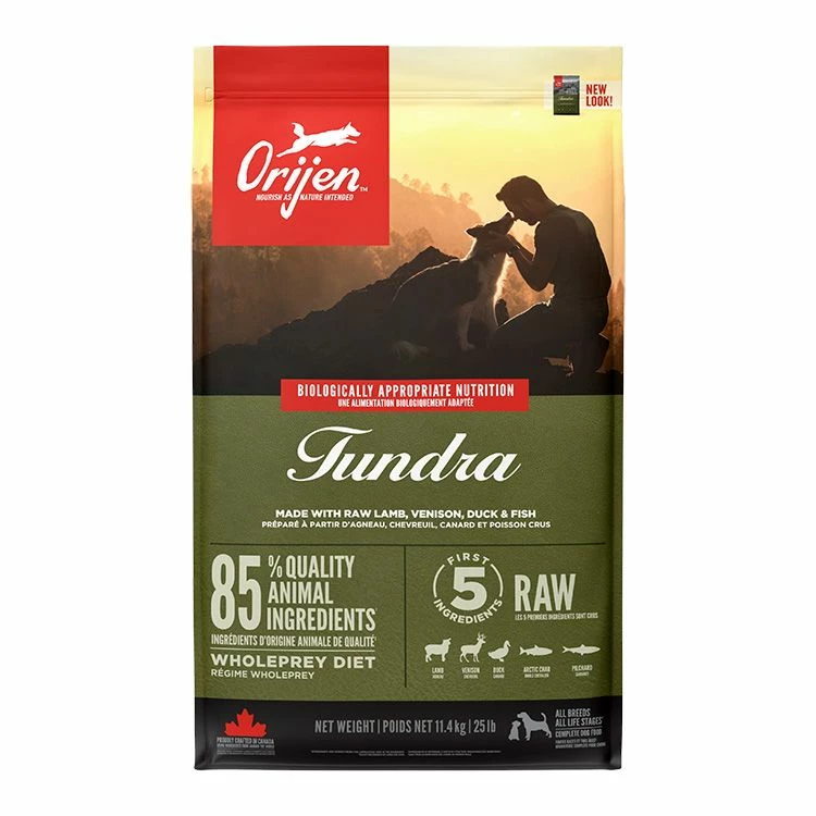 Help your dog thrive with the power of protein-rich recipes that provide peak nourishment. Dogs are ancestral carnivores, so they need a Biologically Appropriate diet rich and varied in whole animal ingredients. ORIJEN® Tundra diet provides your dog with the nourishing protein and nutrients they need, from fresh or raw ingredients like duck, fish and venison. Packed with WholePrey animal ingredients like organs and bone, ORIJEN food is made with the most nutrient-dense, succulent parts of the prey to deliver the nutrition dogs need. With 85% quality animal ingredients and coated with freeze-dried liver, this diet is beyond comparison.