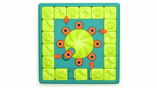 - spin, slide, hide, & seek:Place your dog’s favorite treats or kibble under the sliders in the outer tray and in the center treat compartments. Slide the center covers and outer tiles over the compartments to hide the treats. For an extra challenge, put the ridged orange locks in place to secure the green square tiles. Encourage your dog to seek the treats and let the games begin!
