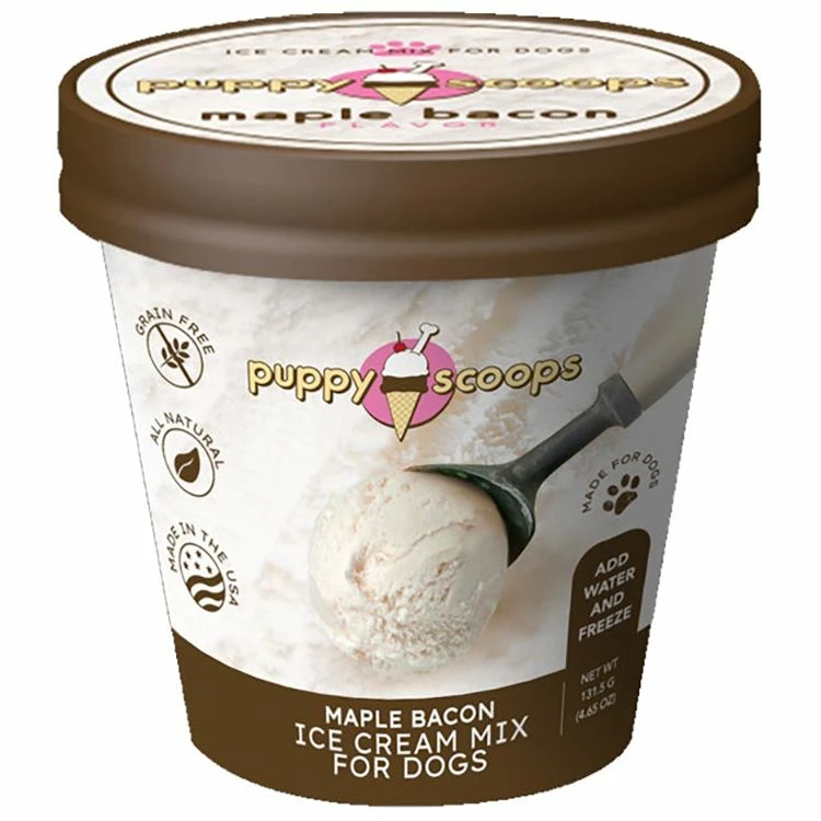 Does your dog come running at the smell of Bacon? Ours too! Which is why we created a Maple flavored ice cream your dogs will adore! This savory yet sweet ice cream flavor is sure to be your dog’s new favorite treat. A pint of Puppy Scoops in any flavor is the perfect gift for dog lovers and pet parents who have dogs and want to feed them exceptional dog food. Dog birthdays should be celebrated with cake and ice cream treats! Puppy Scoops is the perfect dog ice cream recipe for ice treats for dogs that deserve the very best! Just add water, freeze and enjoy!