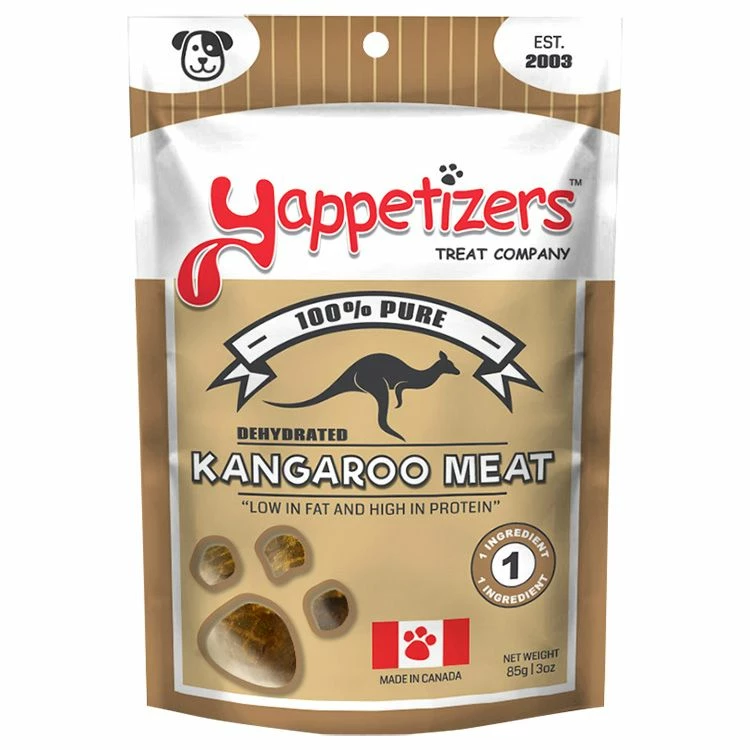 Yappetizers kangaroo trim is one of the lowest fat meats and rich in B vitamins, Omega 3’s, iron and zinc! Kangaroo meat is high in protein and is always free range. As a result their meat is often a healthy choice for pets who suffer from food allergies or intolerance. Our kangaroo trim is slowly dehydrated over a long period of time. This slow process of dehydration perfectly preserves this treat without the use of additives or preservatives. Our dehydration process removes almost all of the moisture allowing our products to be naturally shelf stable for over 2 years. As with all of our products our kangaroo trim is human-grade and sourced from federally inspected plants. This kangaroo treat is hand-made in our very own CFIA (Canadian Food Inspection Agency) certified plant located in Richmond, BC Canada.